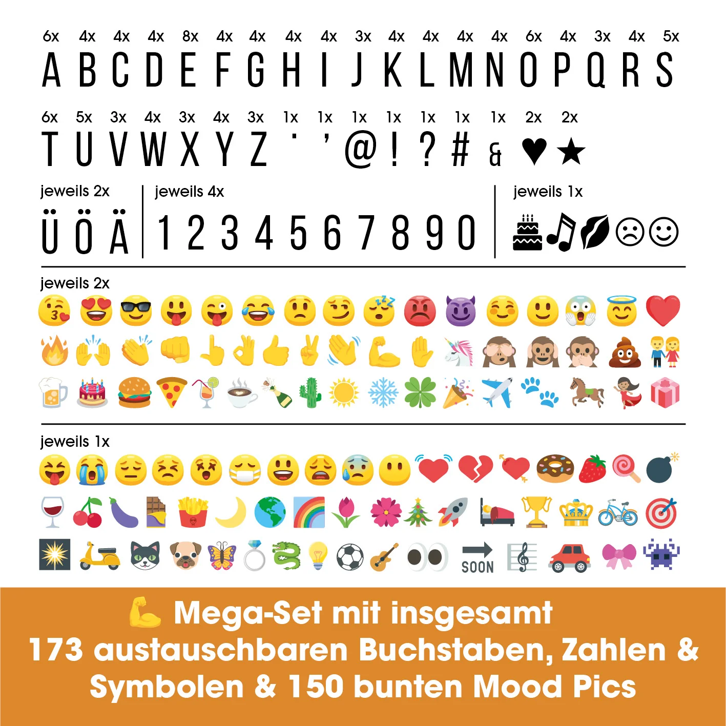 - Mega-Set mit insgesamt 173 austauschbaren Buchstaben, Zahlen & Symbolen & 150 bunten moodjis