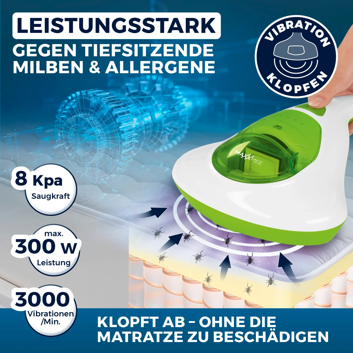 - LEISTUNGSSTARK: 8 kPa Saugkraft, max. 300 Watt, 3000 Vibrationen/min – klopft Matratzen & Co. ohne zu beschädigen ab